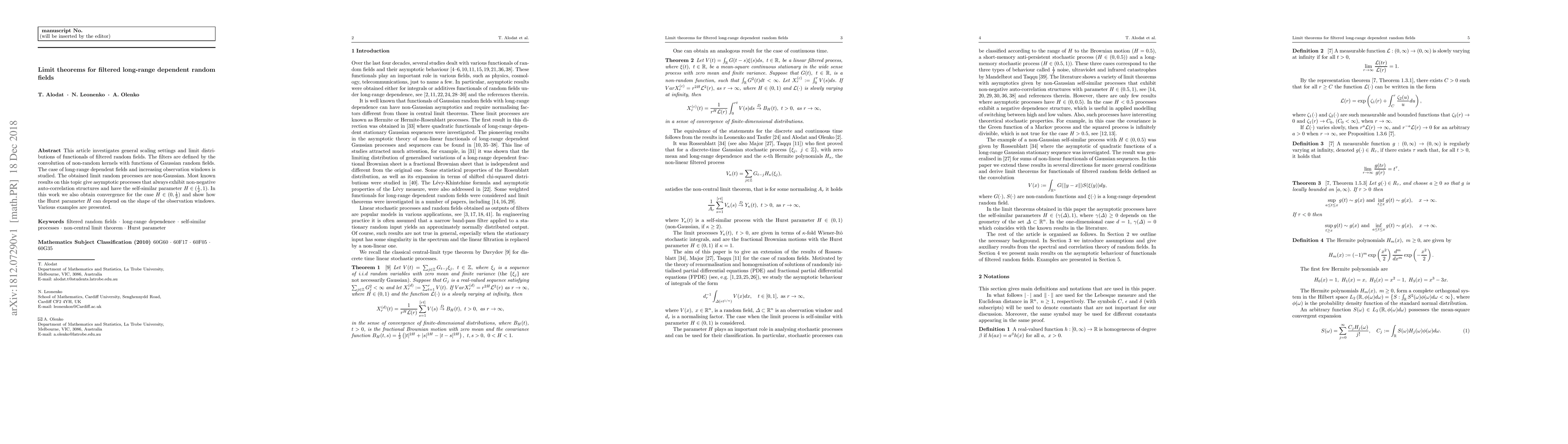 The paper derives general limit theorems for filtered long-range dependent random fields, extending existing results to a broader range of Hurst parameters and providing insights into the dependence of these parameters on observation window shapes.