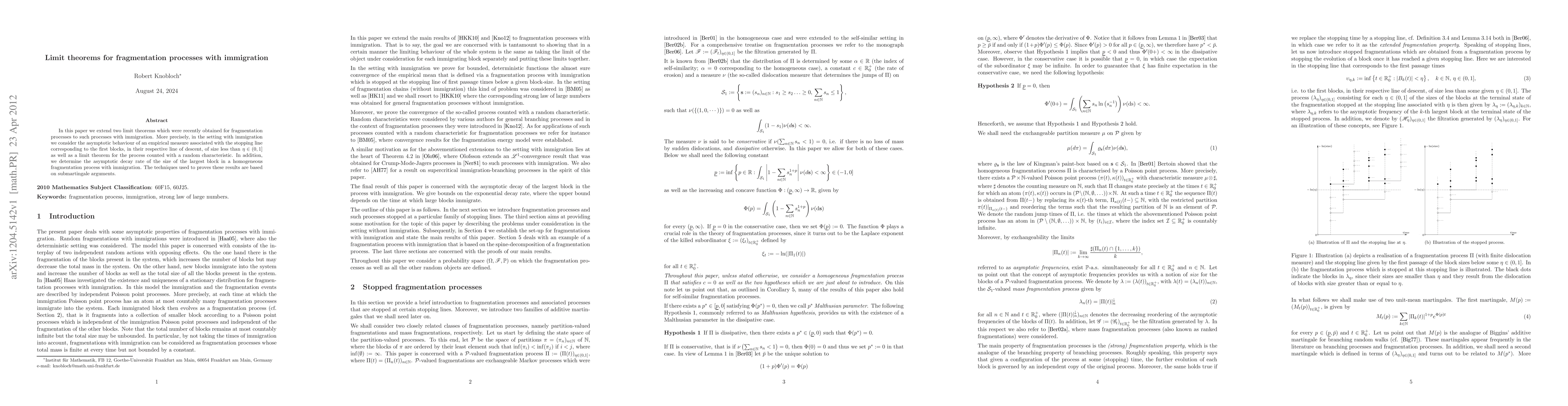 This paper extends limit theorems for fragmentation processes to those with immigration, analyzing size distribution and asymptotic behavior of key characteristics.