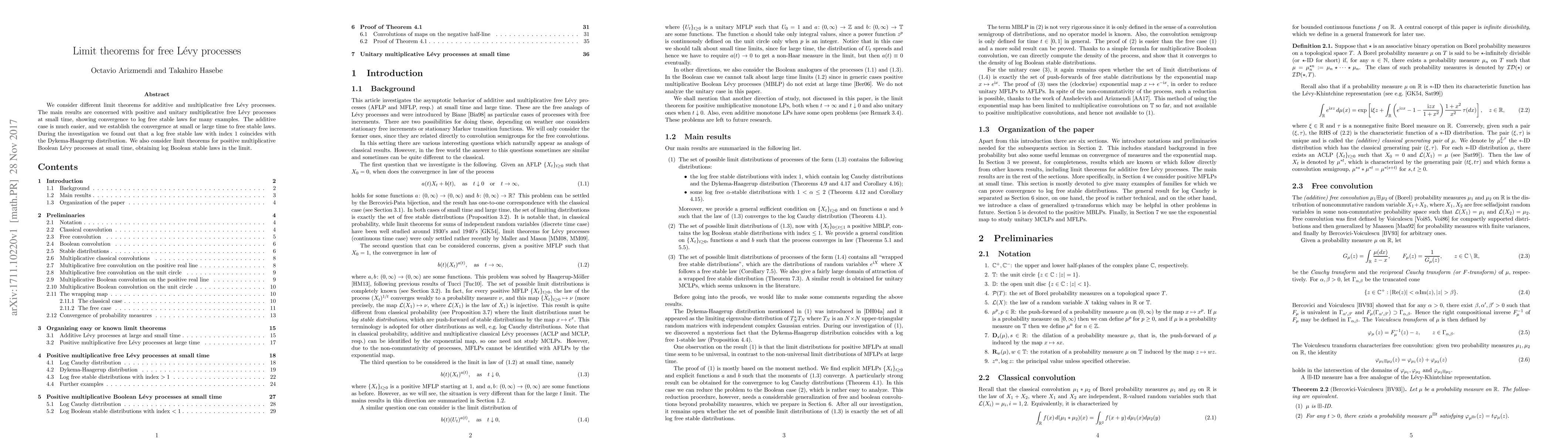 This paper explores limit theorems for additive and multiplicative free Lévy processes, demonstrating convergence to log free stable laws, including the Dykema-Haagerup distribution for index $1$. It also investigates positive multiplicative Boolean Lévy processes, showing their convergence to log Boolean stable laws.