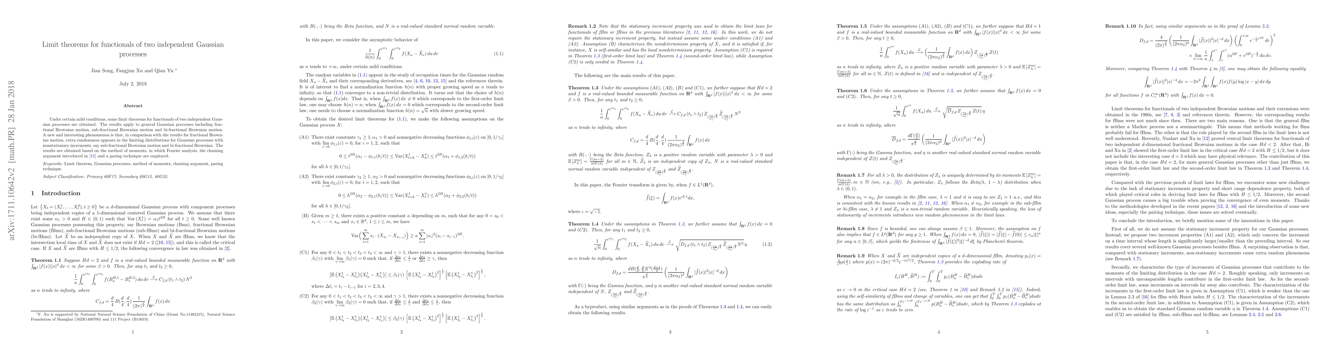 This paper establishes limit theorems for functionals of two independent Gaussian processes, including fractional, sub-fractional, and bi-fractional Brownian motions. It reveals an additional randomness in the limiting distributions for processes with nonstationary increments, achieved through the method of moments using Fourier analysis, chaining arguments, and a pairing technique.