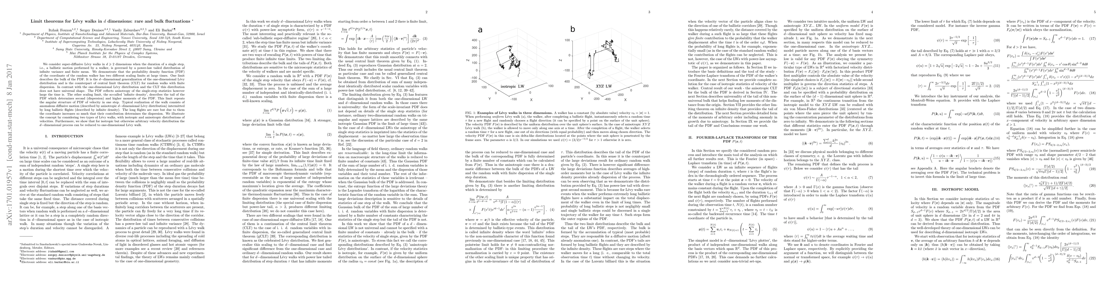 This paper investigates super-diffusive Lévy walks in $d$ dimensions, revealing two distinct scaling limits for the probability density function of the walker's position: an anisotropic bulk distribution and a rare, high-density tail that influences the walk's dispersion. The study demonstrates that while the bulk distribution reflects the anisotropy of single-step statistics, the tail's structure determines higher moments and is characterized by infrequent but significant long ballistic flights.
