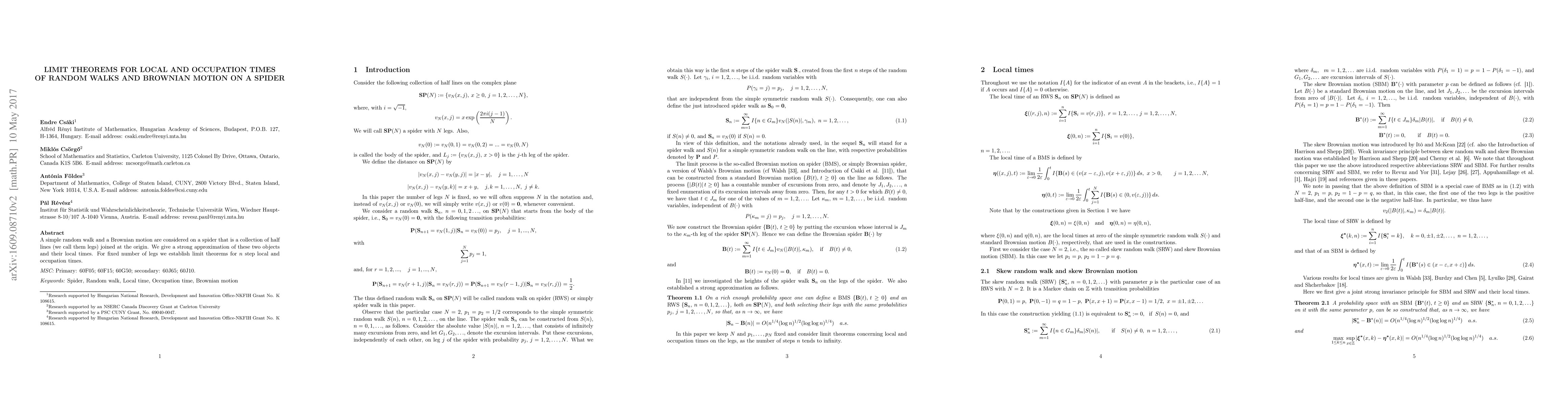 This paper establishes limit theorems for local and occupation times of random walks and Brownian motion on a spider-shaped graph with a fixed number of legs, providing strong approximations in n steps.