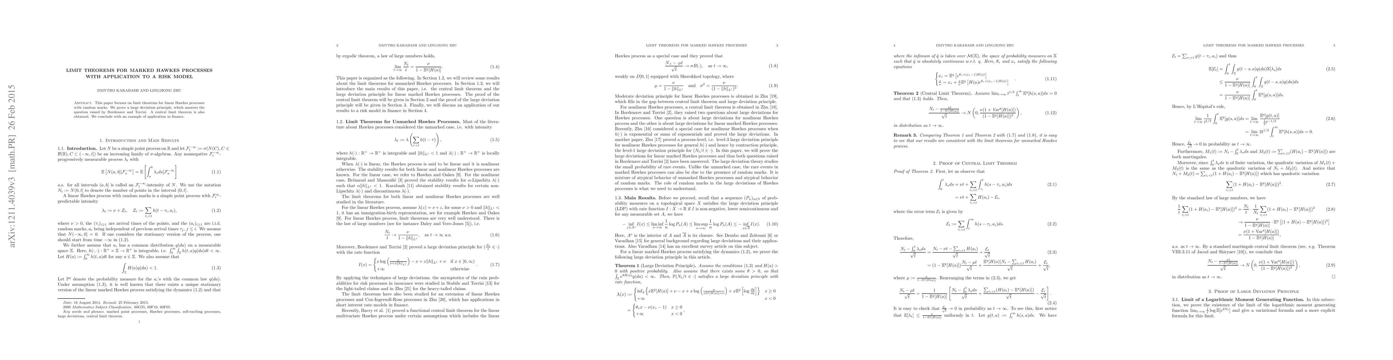 This paper establishes limit theorems for linear Hawkes processes with random marks, proving a large deviation principle and a central limit theorem. An application in a financial risk model is demonstrated.