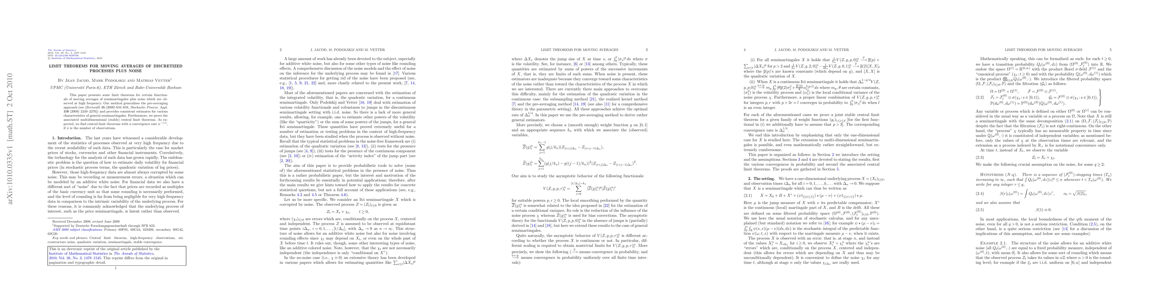 This paper presents some limit theorems for certain functionals of moving averages of semimartingales plus noise which are observed at high frequency. Our method generalizes the pre-averaging approach (see [Bernoulli 15 (2009) 634--658, Stochastic Process. Appl. 119 (2009) 2249--2276]) and provides consistent estimates for various characteristics of general semimartingales. Furthermore, we prove the associated multidimensional (stable) central limit theorems. As expected, we find central limit theorems with a convergence rate $n^{-1/4}$, if $n$ is the number of observations.