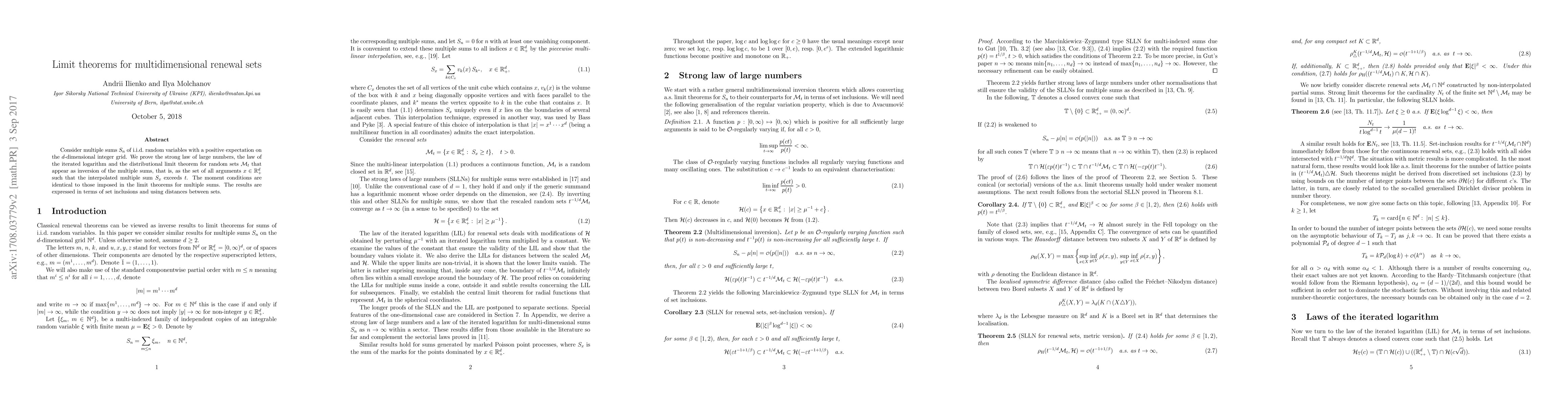 This paper proves limit theorems for multidimensional renewal sets generated by i.i.d. random variables, including the strong law of large numbers, the law of the iterated logarithm, and the distributional limit theorem, expressed in terms of set inclusions and distances.