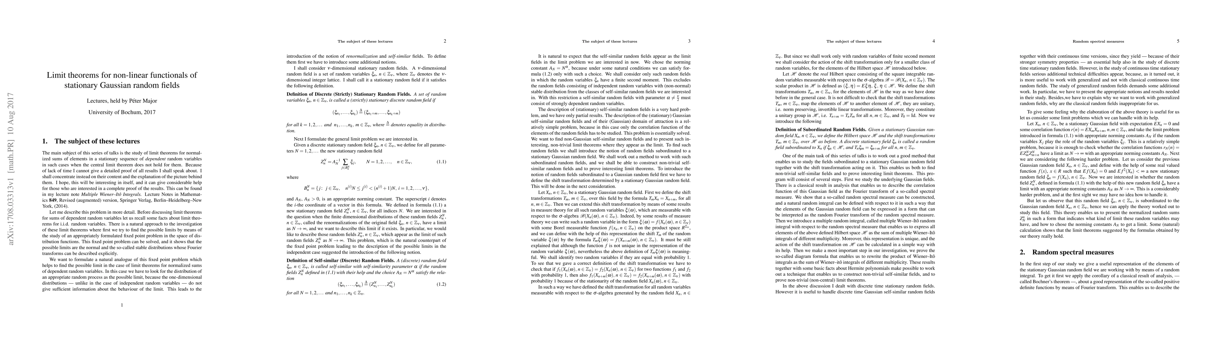 This is an extended version of a series of talks I held at the University of Bochum in 2017 about limit theorems for non-linear functionals of stationary Gaussian random fields. The goal of these talks was to give a fairly detailed introduction to the theory leading to such results, even if some of the results are presented without proof. On the other hand, I gave a simpler proof for some of the results. (The proofs omitted from this text can be found in my Springer Lecture Note Multiple Wiener--Ito Integrals. In this note first I discuss the spectral representation of the covariance function of a Gaussian stationary rendom field by means of the spectral measure and the representation of the elements of the random field by means of a random integral with respect to the random spectral measure. Then I construct the multiple random integrals with respect to the random spectral measure and prove their most important properties. Finally I show some interesting applications of these multiple random integrals. In particular, I prove some non-trivial non-Gaussian limit theorems