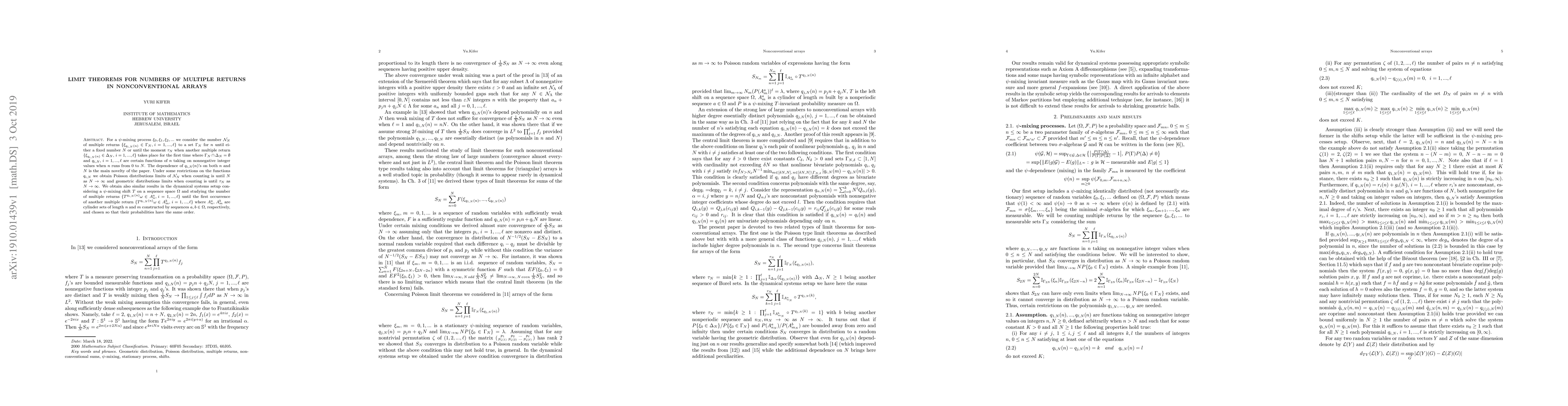 This research establishes limit theorems for multiple returns in nonconventional arrays of a u201cpsiu201d-mixing process and dynamical systems. It finds Poisson limits for counts until a fixed N and geometric limits until the first occurrence of another multiple return as N approaches infinity. The novelty lies in considering functions q_i,N that depend on both n and N.