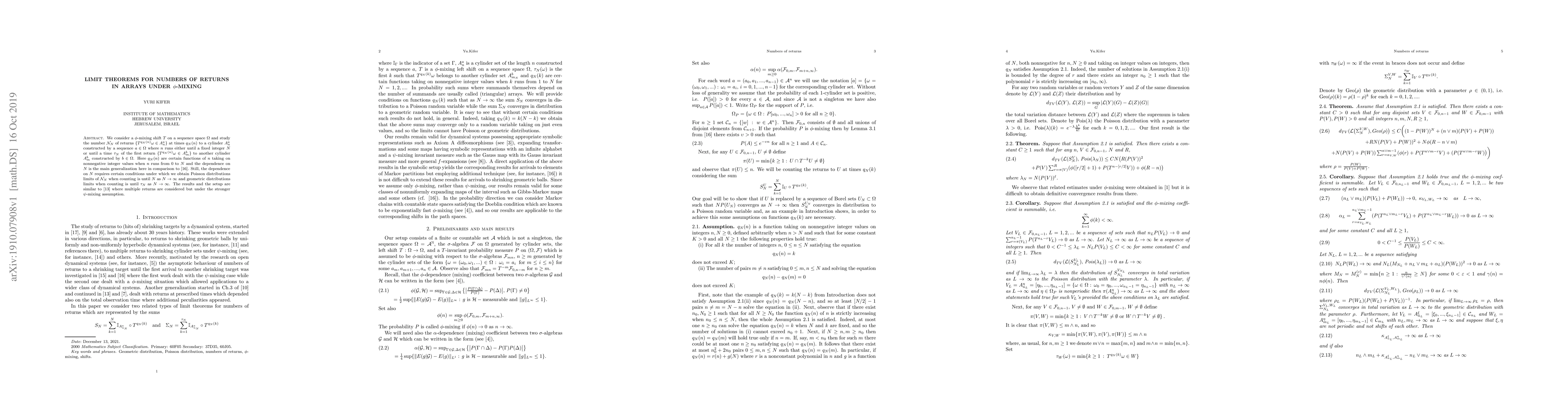We consider a $\phi$-mixing shift $T$ on a sequence space $\Om$ and study the number $\cN_N$ of returns $\{ T^{q_N(n)}\om\in A^a_n\}$ at times $q_N(n)$ to a cylinder $A^a_n$ constructed by a sequence $a\in\Om$ where $n$ runs either until a fixed integer $N$ or until a time $\tau_N$ of the first return $\{ T^{q_N(n)}\om\in A^b_m\}$ to another cylinder $A^b_m$ constructed by $b\in\Om$. Here $q_N(n)$ are certain functions of $n$ taking on nonnegative integer values when $n$ runs from 0 to $N$ and the dependence on $N$ is the main generalization here which requires certain conditions under which we obtain Poisson distributions limits of $\cN_N$ when counting is until $N$ as $N\to\infty$ and geometric distributions limits when counting is until $\tau_N$ as $N\to\infty$.