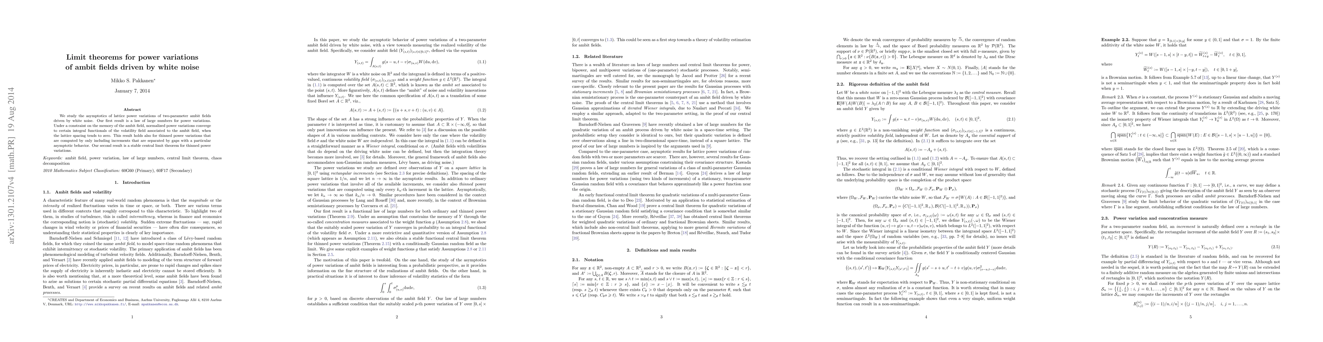 This paper studies the asymptotics of lattice power variations of two-parameter ambit fields driven by white noise, establishing a law of large numbers for normalized power variations and a stable central limit theorem for thinned power variations.