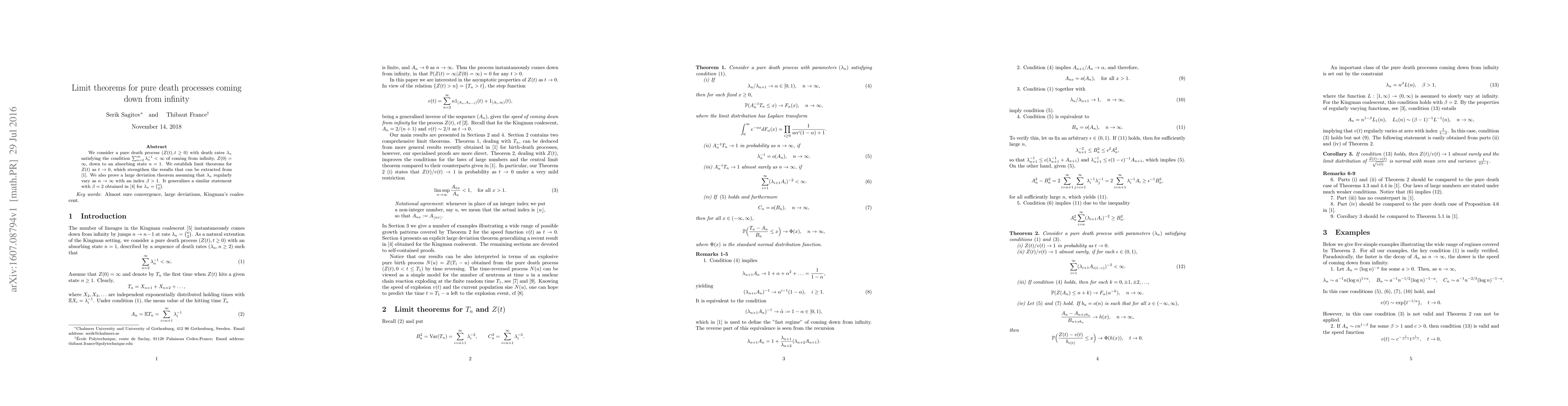 This paper establishes limit theorems for a pure death process starting from infinity and decreasing to an absorbing state, improving upon previous results. It also proves a large deviation theorem under the assumption that death rates follow a regular variation with an index greater than 1, generalizing a specific case previously studied.