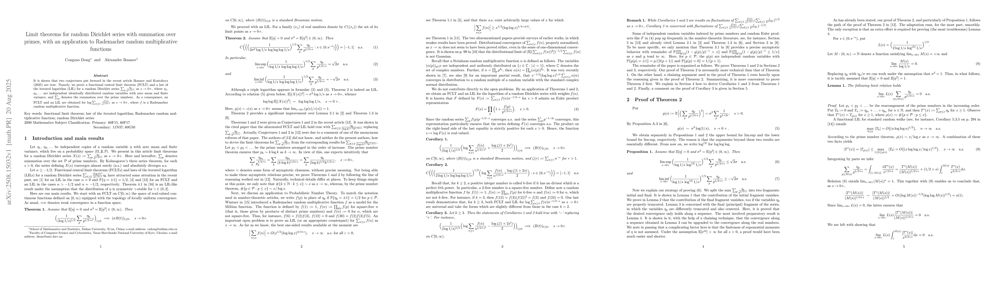 It is shown that two conjectures put forward in the recent article Iksanov and Kostohryz (2025) are true. Namely, we prove a functional central limit theorem (FCLT) and a law of the iterated logarithm (LIL) for a random Dirichlet series $\sum_p \frac{\eta_p}{p^{1/2+s}}$ as $s\to 0+$, where $\eta_1$, $\eta_2,\ldots$ are independent identically distributed random variables with zero mean and finite variance, and $\sum_p$ denotes the summation over the prime numbers. As a consequence, an FCLT and an LIL are obtained for $\log \sum_{n\geq 1} \frac{f(n)}{n^{1/2+s}}$ as $s\to 0+$, where $f$ is a Rademacher random multiplicative function.