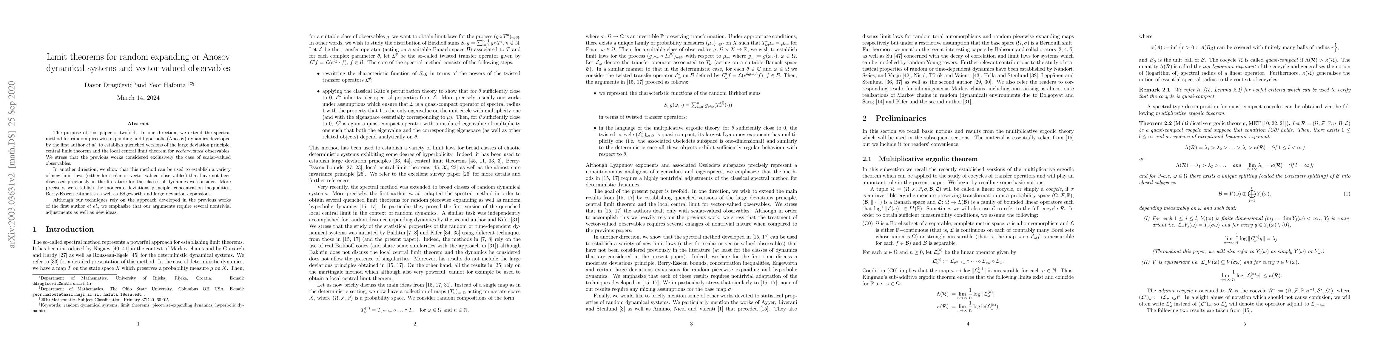 This paper extends the spectral method for random expanding or hyperbolic dynamical systems to vector-valued observables, establishing quenched versions of the large deviation principle, central limit theorem, and local central limit theorem. It also introduces new limit laws including the moderate deviation principle and concentration inequalities, requiring nontrivial adjustments to previous techniques.