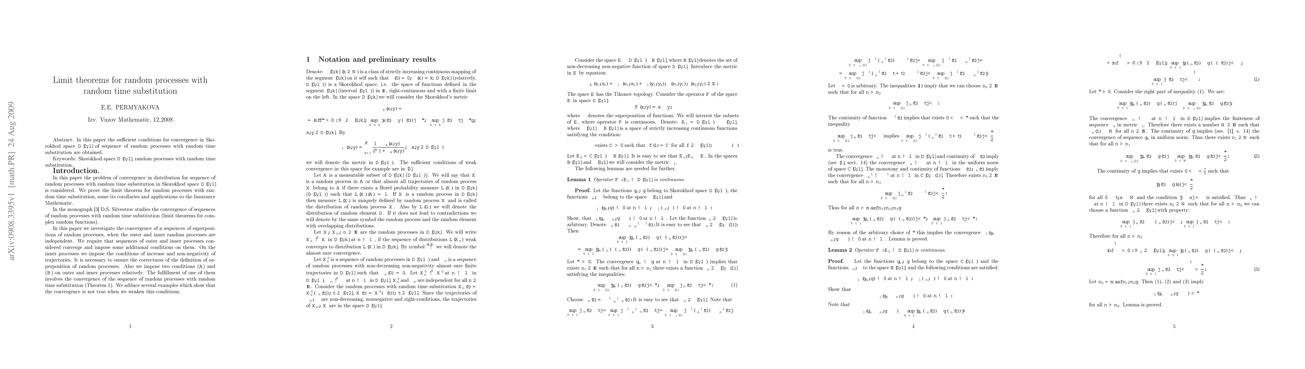 Summary: This paper establishes sufficient conditions for the convergence of sequences of random processes with random time substitution in the Skorokhod space $D[0,1]$. The focus is on identifying the criteria that ensure such convergence.