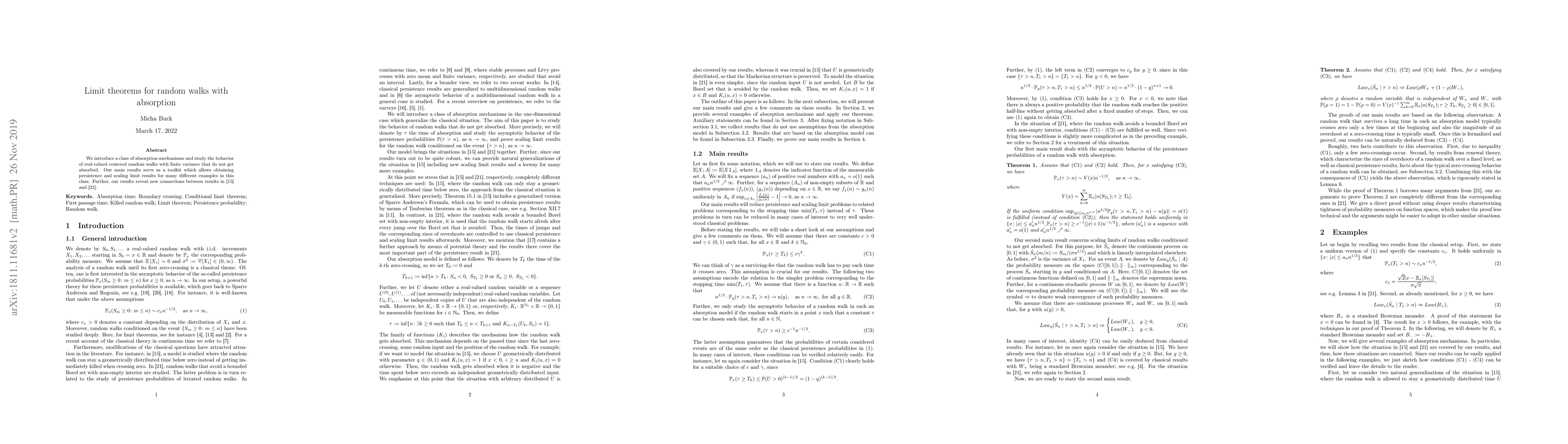 We introduce a class of absorption mechanisms and study the behavior of real-valued centered random walks with finite variance that do not get absorbed. In particular, we prove persistence and scaling limit results, which, in many cases of interests, reduce the analysis of the considered situation to well understood classical persistence and scaling limit questions. Our results cover results in Kemperman (1961) and Vysotsky (2015) and can be applied for many more examples.