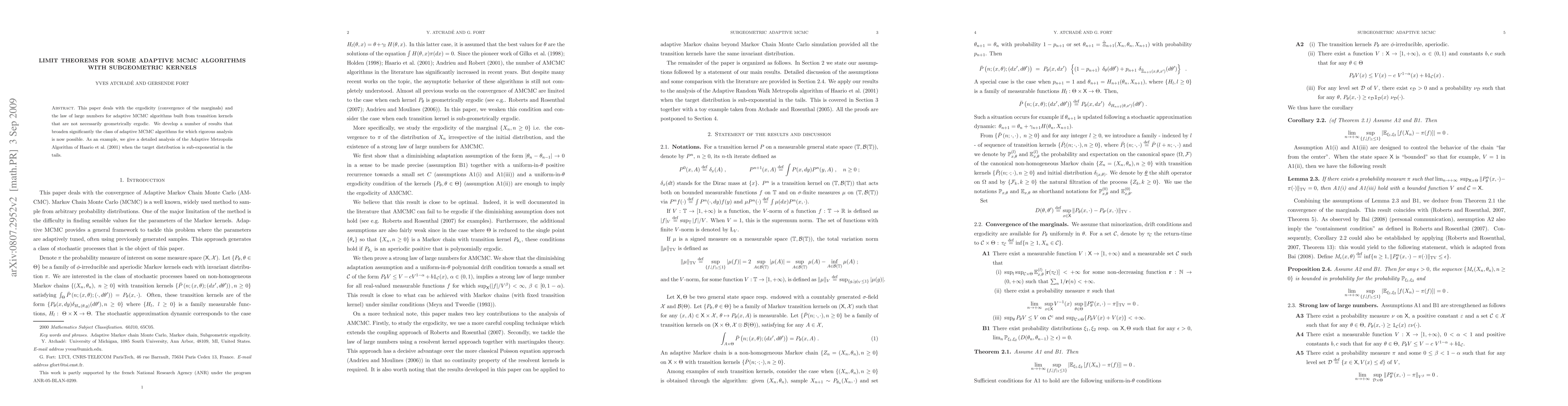 This paper establishes ergodicity and a strong law of large numbers for adaptive MCMC algorithms under diminishing adaptation and drift conditions. It extends rigorous analysis to a broader class of adaptive MCMC methods, exemplified by a detailed study of the Adaptive Metropolis Algorithm for sub-exponential distributions.
