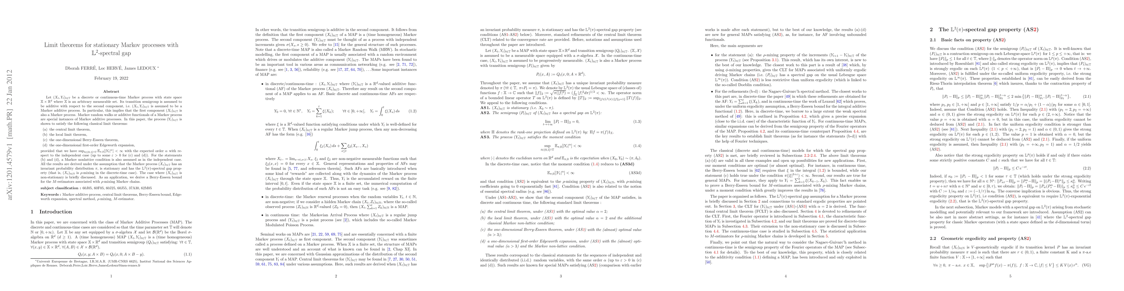 Let $(X_t, Y_t)_{t\in T}$ be a discrete or continuous-time Markov process with state space $X \times R^d$ where $X$ is an arbitrary measurable set. Its transition semigroup is assumed to be additive with respect to the second component, i.e. $(X_t, Y_t)_{t\in T}$ is assumed to be a Markov additive process. In particular, this implies that the first component $(X_t)_{t\in T}$ is also a Markov process. Markov random walks or additive functionals of a Markov process are special instances of Markov additive processes. In this paper, the process $(Y_t)_{t\in T}$ is shown to satisfy the following classical limit theorems: (a) the central limit theorem, (b) the local limit theorem, (c) the one-dimensional Berry-Esseen theorem, (d) the one-dimensional first-order Edgeworth expansion, provided that we have sup{t\in(0,1]\cap T : E{\pi,0}[|Y_t| ^{\alpha}] < 1 with the expected order with respect to the independent case (up to some $\varepsilon > 0$ for (c) and (d)). For the statements (b) and (d), a Markov nonlattice condition is also assumed as in the independent case. All the results are derived under the assumption that the Markov process $(X_t)_{t\in T}$ has an invariant probability distribution $\pi$, is stationary and has the $L^2(\pi)$-spectral gap property (that is, $(X_t)t\in N}$ is $\rho$-mixing in the discrete-time case). The case where $(X_t)_{t\in T}$ is non-stationary is briefly discussed. As an application, we derive a Berry-Esseen bound for the M-estimators associated with $\rho$-mixing Markov chains.