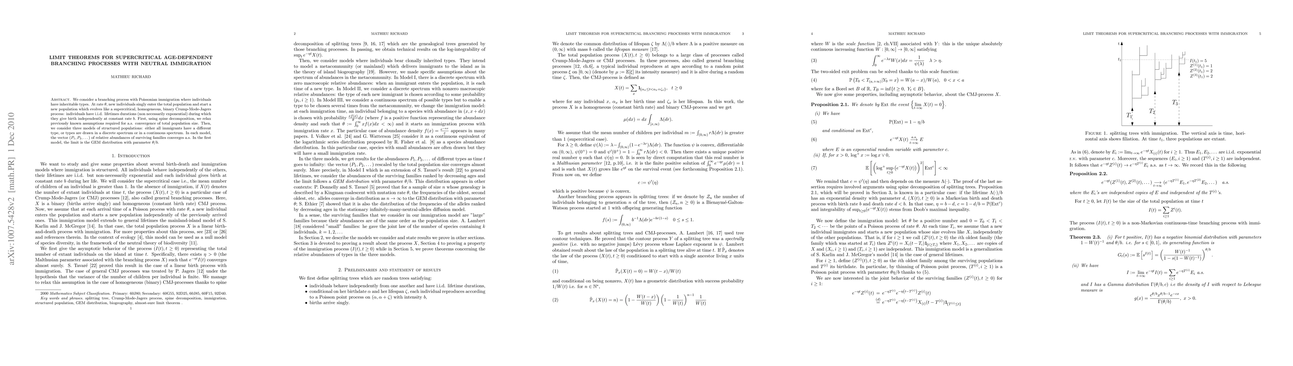 This research paper explores limit theorems for age-dependent branching processes with neutral immigration, finding that relative abundances of surviving families converge almost surely to a GEM distribution in three different model scenarios.