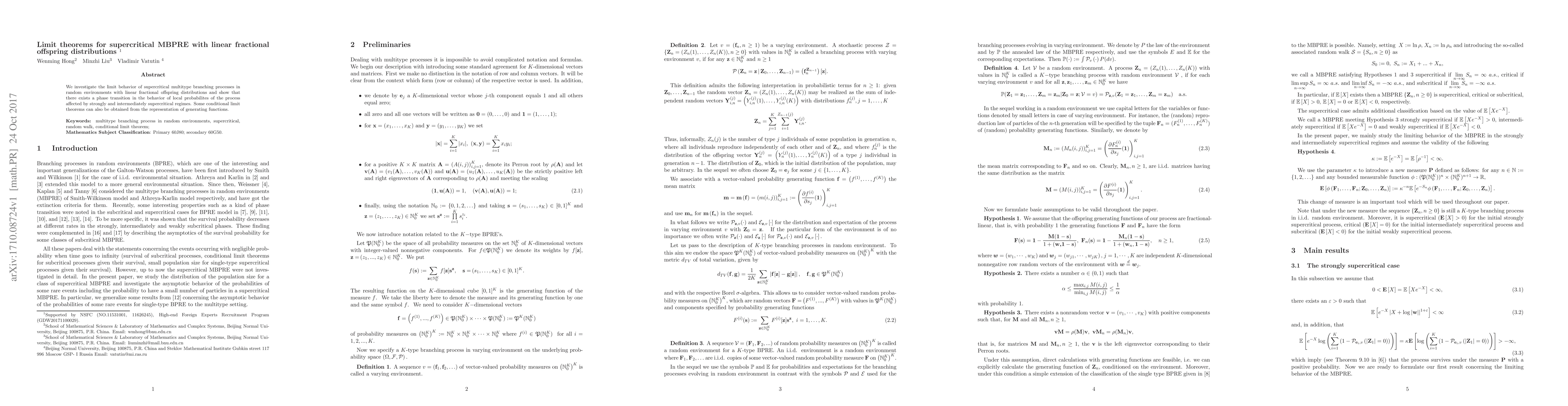 This paper examines the limit behavior of supercritical multitype branching processes in random environments with linear fractional offspring distributions, revealing a phase transition between strongly and intermediately supercritical regimes affecting local probabilities, and deriving conditional limit theorems from generating functions.