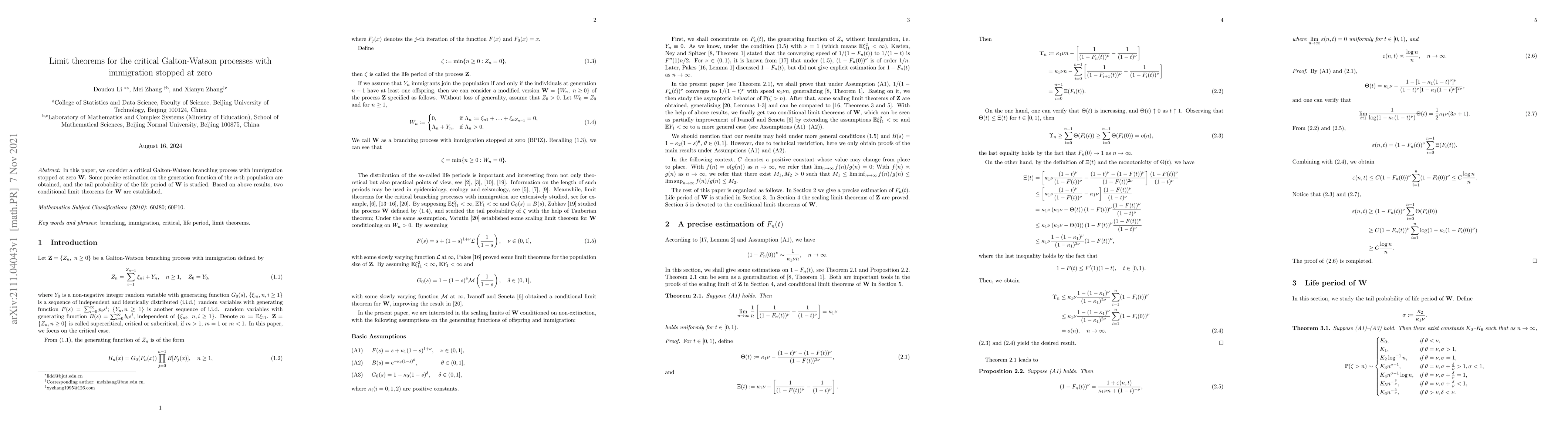 This paper investigates a critical Galton-Watson process with immigration, stopped at zero, deriving precise estimates for its generation function and establishing conditional limit theorems for its tail probability.