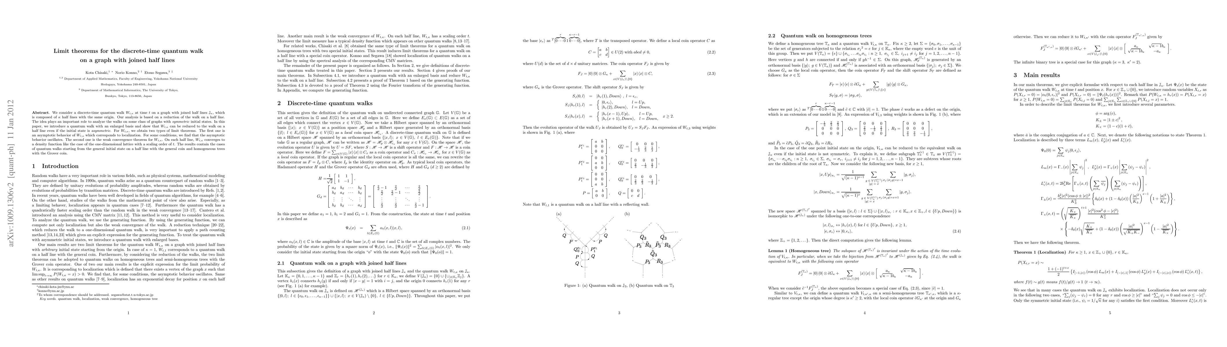 This paper studies the discrete-time quantum walk $W_{t,\kappa}$ on a graph composed of $\kappa$ joined half lines, introducing a method to reduce the walk to a half line even for asymmetric initial states. The authors derive two limit theorems: one showing localization with oscillatory behavior under certain conditions, and another proving weak convergence to a density function on each half line.