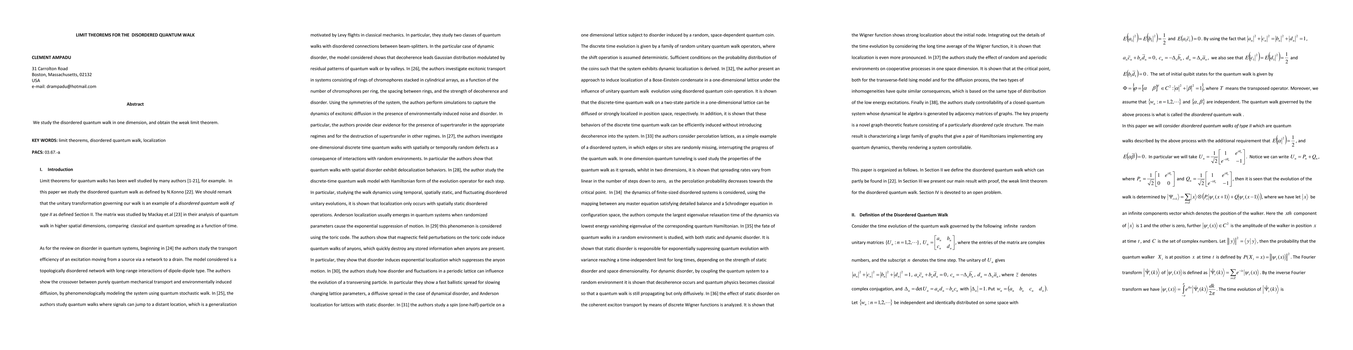 Summary: This paper investigates the disordered quantum walk in one-dimensional systems, establishing a weak limit theorem that characterizes its behavior under disorder.