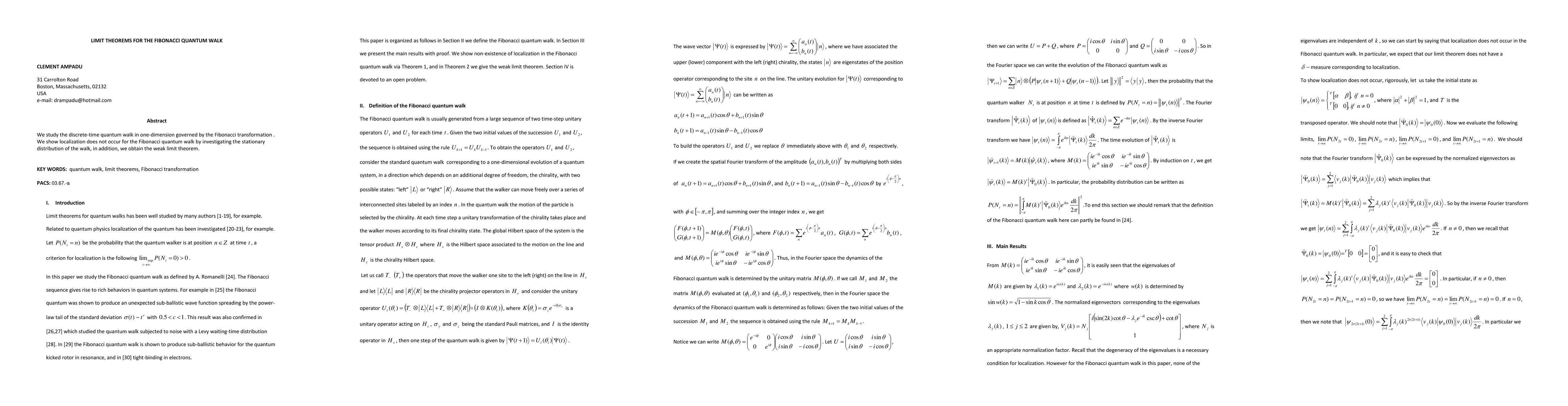 Summary: This paper investigates the one-dimensional Fibonacci quantum walk, demonstrating that it does not localize and presenting the stationary distribution and a weak limit theorem for the walk.