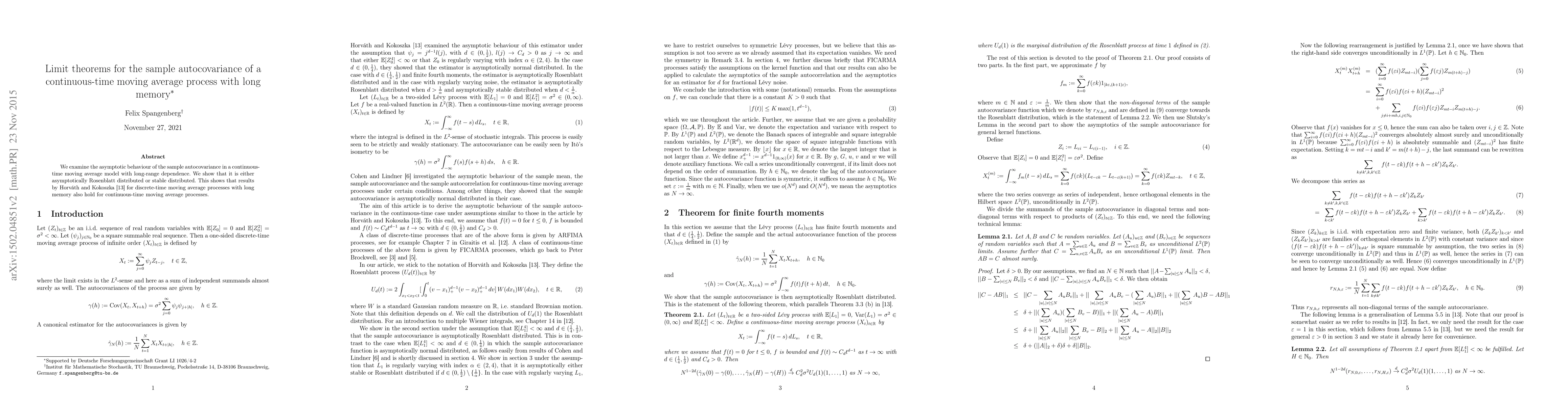A study on continuous-time moving average processes with long memory shows that sample autocovariance is either asymptotically Rosenblatt distributed or stable distributed, extending results for discrete-time processes to the continuous-time case.