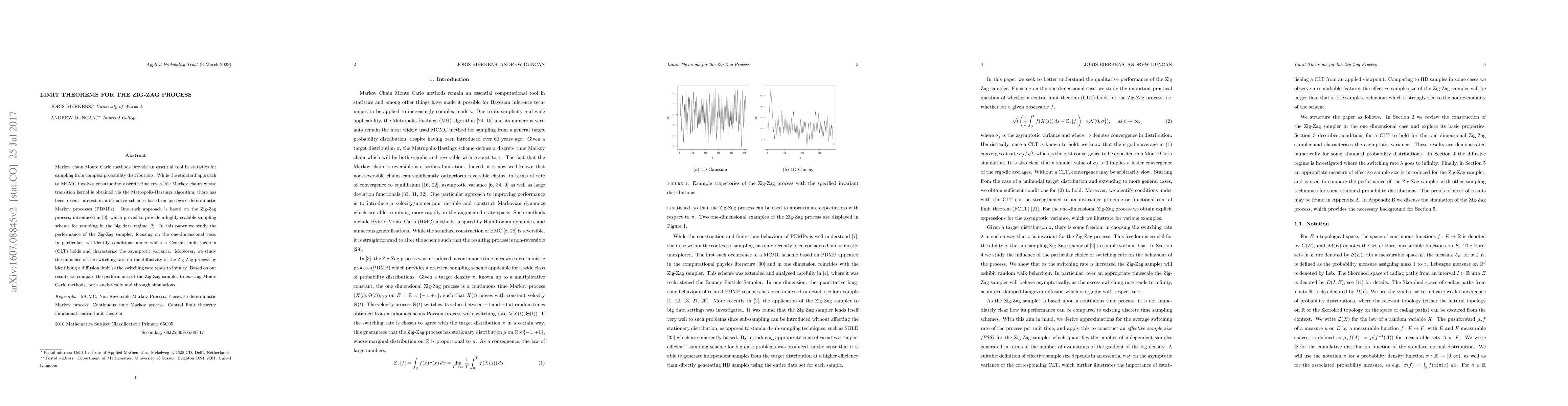 This paper investigates the Zig-Zag process, a scalable alternative to traditional MCMC methods, focusing on its one-dimensional case. It establishes conditions for a Central Limit Theorem and characterizes the asymptotic variance, while also exploring the diffusion limit as the switching rate increases.