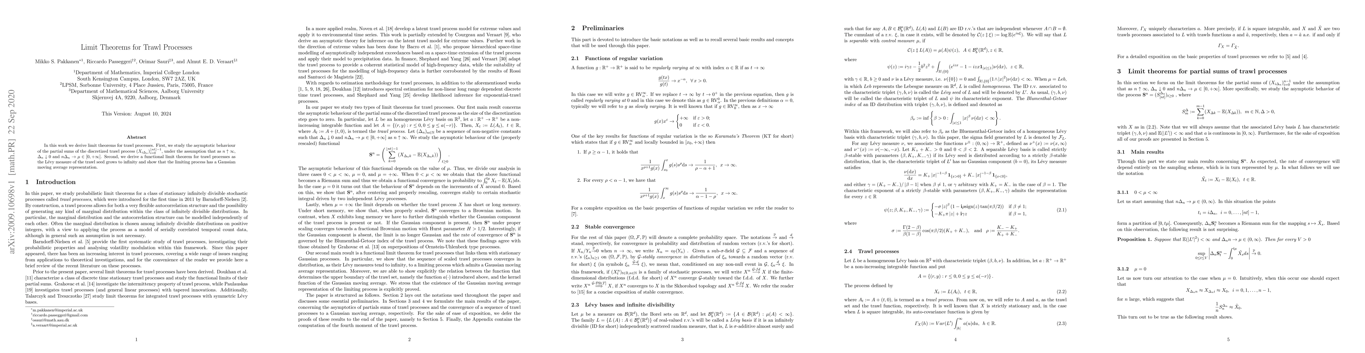 This paper derives limit theorems for trawl processes, focusing on the asymptotic behavior of discretized trawl process partial sums and establishing a functional limit theorem showing that the limiting process has a Gaussian moving average representation as the Lévy measure of the trawl seed grows.