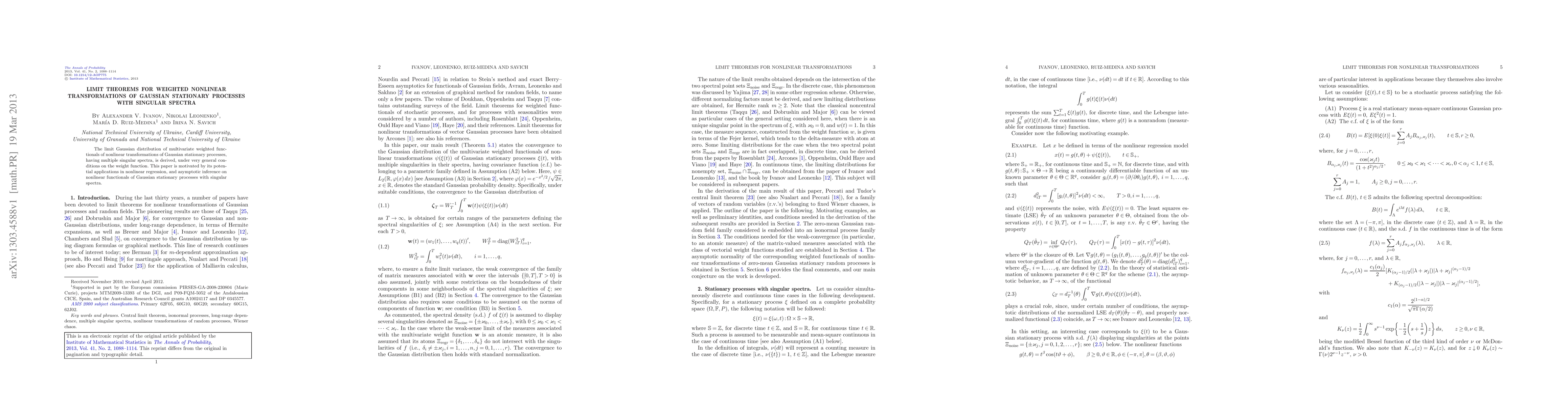 The limit Gaussian distribution of multivariate weighted functionals of nonlinear transformations of Gaussian stationary processes, having multiple singular spectra, is derived, under very general conditions on the weight function. This paper is motivated by its potential applications in nonlinear regression, and asymptotic inference on nonlinear functionals of Gaussian stationary processes with singular spectra.