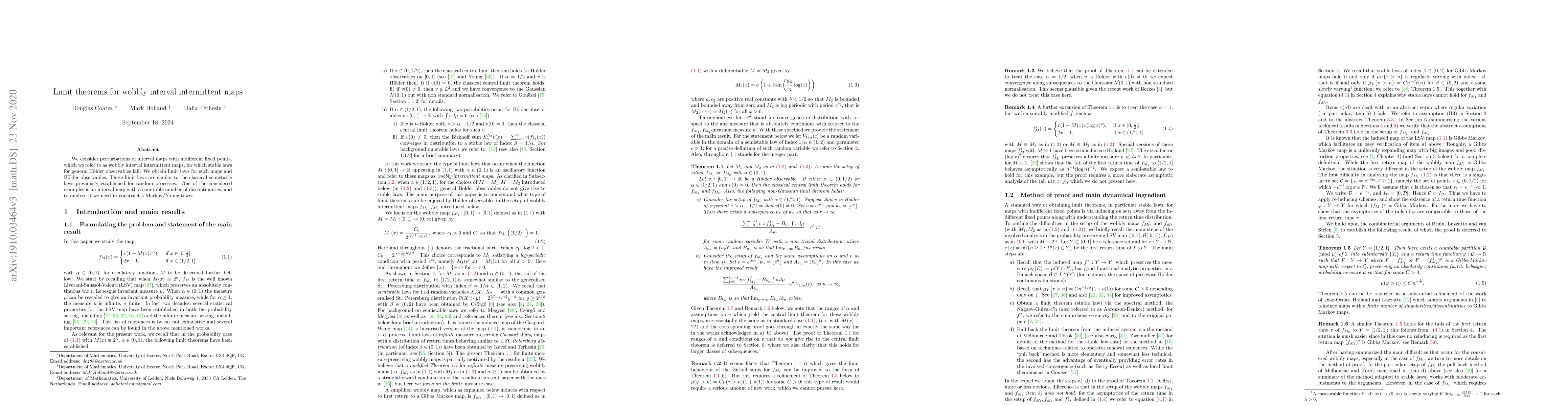 This paper investigates limit theorems for wobbly interval intermittent maps with indifferent fixed points, where stable laws for H\"older observables do not apply. The authors establish new limit laws for these maps, akin to classical semistable laws, while highlighting specific limitations due to the dynamical setup, and utilize a Markov/Young tower to analyze an example with countable discontinuities.