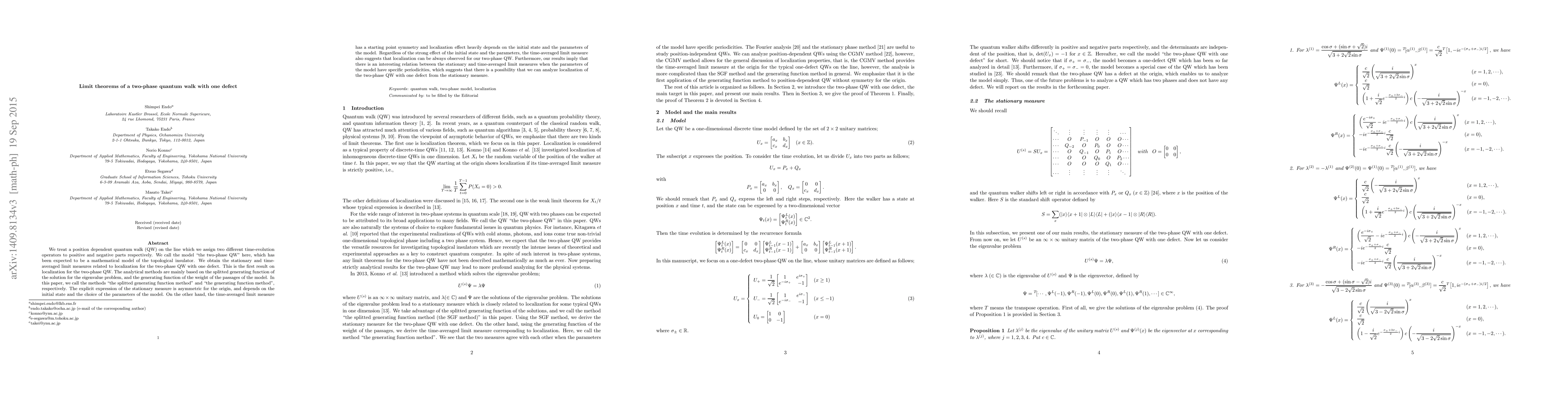 We treat a position dependent quantum walk (QW) on the line which we assign two different time-evolution operators to positive and negative parts respectively. We call the model "the two-phase QW" here, which has been expected to be a mathematical model of the topological insulator. We obtain the stationary and time-averaged limit measures related to localization for the two-phase QW with one defect. This is the first result on localization for the two-phase QW. The analytical methods are mainly based on the splitted generating function of the solution for the eigenvalue problem, and the generating function of the weight of the passages of the model. In this paper, we call the methods "the splitted generating function method" and "the generating function method", respectively. The explicit expression of the stationary measure is asymmetric for the origin, and depends on the initial state and the choice of the parameters of the model. On the other hand, the time-averaged limit measure has a starting point symmetry and localization effect heavily depends on the initial state and the parameters of the model. Regardless of the strong effect of the initial state and the parameters, the time-averaged limit measure also suggests that localization can be always observed for our two-phase QW. Furthermore, our results imply that there is an interesting relation between the stationary and time-averaged limit measures when the parameters of the model have specific periodicities, which suggests that there is a possibility that we can analyze localization of the two-phase QW with one defect from the stationary measure.