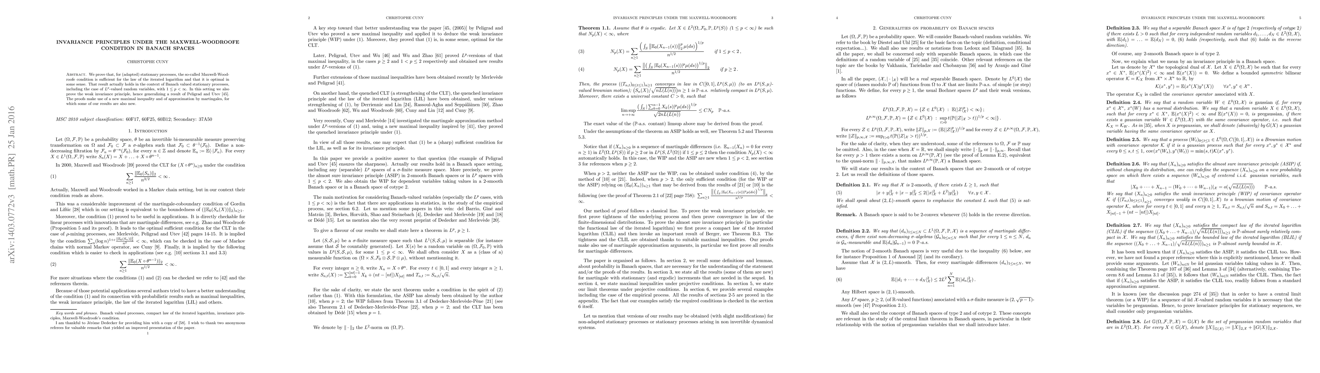 We prove that, for (adapted) stationary processes, the so-called Maxwell-Wood-roofe condition is sufficient for the law of the iterated logarithm and that it is optimal in some sense. We obtain a similar conclusion concerning the Marcinkiewicz-zygmund strong law of large numbers. Those results actually hold in the context of Banach valued stationary processes, including the case of $L^r$-valued random variables, with $1\le r<\infty$. In this setting we also prove the weak invariance principle, under a version of the Maxwell-Woodroofe condition, generalizing a result of Peligrad and Utev \cite{PU}. Our results extend to non-adapted processes as well, and, partly to stationary processes arising from dynamical systems. The proofs make use of a new maximal inequality and of approximation by martingales, for which some of our results are also new.