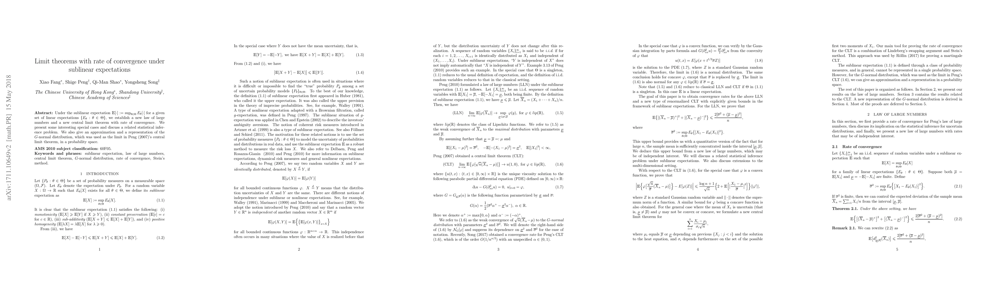 This paper establishes a new law of large numbers and a central limit theorem under sublinear expectations, providing a rate of convergence. It also discusses statistical inference and represents the $G$-normal distribution in a probability space.