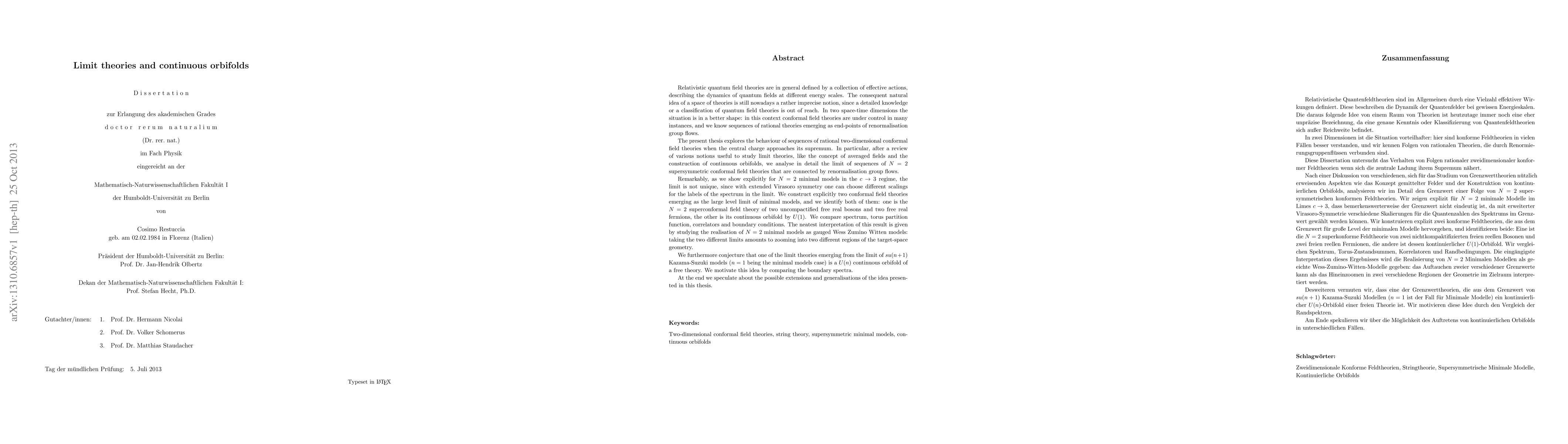 Relativistic QFTs are in general defined by a collection of effective actions, describing the dynamics of quantum fields at different energy scales. The consequent natural idea of a space of theories is still a rather imprecise notion, since a detailed knowledge or a classification of QFTs is out of reach. In two dimensions the situation is in a better shape: in this context CFTs are under control in many instances, and we know sequences of rational theories emerging as end-points of RG flows. The present thesis explores the behaviour of sequences of rational two-dimensional CFTs when the central charge approaches its supremum. After a review of various notions useful to study limit theories, like the concept of averaged fields and the construction of continuous orbifolds, we analyse in detail the limit of sequences of N=2 supersymmetric CFTs that are connected by RG flows. The limit is not unique, since with extended Virasoro symmetry one can choose different scalings for the labels of the spectrum in the limit. We construct explicitly two c=3 CFTs emerging as the large level limit of minimal models, and we identify both of them: one is the N=2 CFT of two uncompactified free real bosons and two free real fermions, the other is its continuous orbifold by U(1). We compare spectrum, torus partition function, correlators and boundary conditions. The neatest interpretation of this result is given by studying the realisation of N=2 minimal models as gauged WZW models: taking the two different limits amounts to zooming into two different regions of the target-space geometry. At the end we speculate about possible extensions and generalisations.