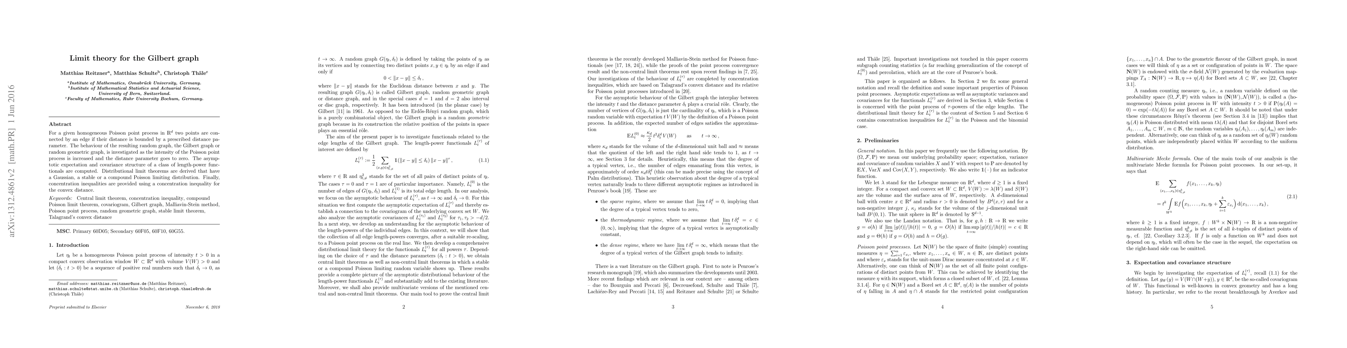 The paper investigates the behavior of the Gilbert graph as a Poisson point process intensity increases and its distance parameter approaches zero, leading to Gaussian, stable, or compound Poisson limiting distributions.