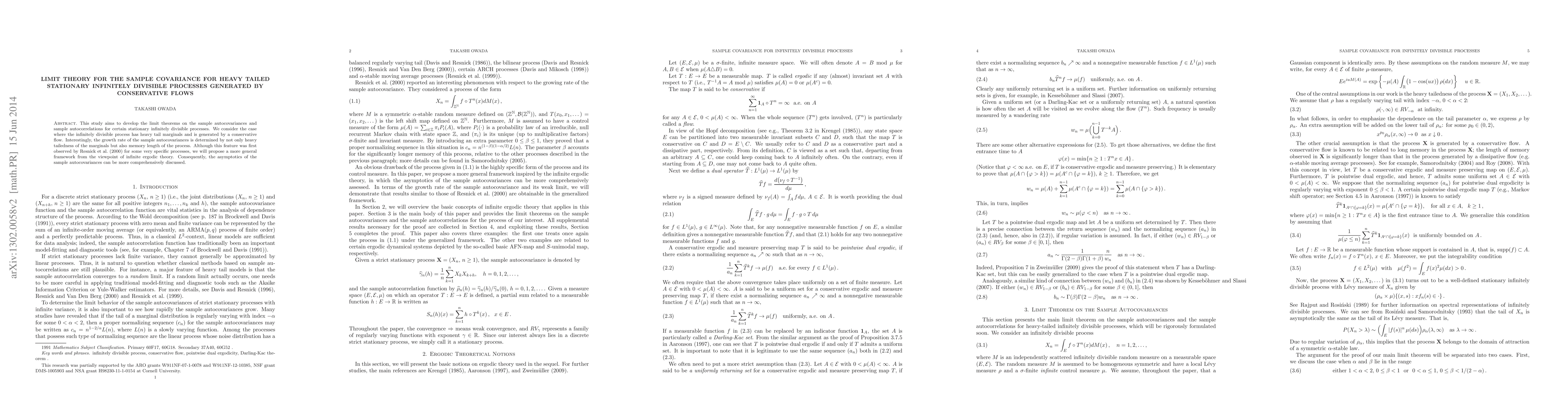 This paper develops limit theorems for the sample autocovariances of stationary infinitely divisible processes with heavy-tailed marginals generated by conservative flows, showing that the growth rate depends on both the tail behavior and the memory length of the process. It extends the framework from infinite ergodic theory for a more general analysis.