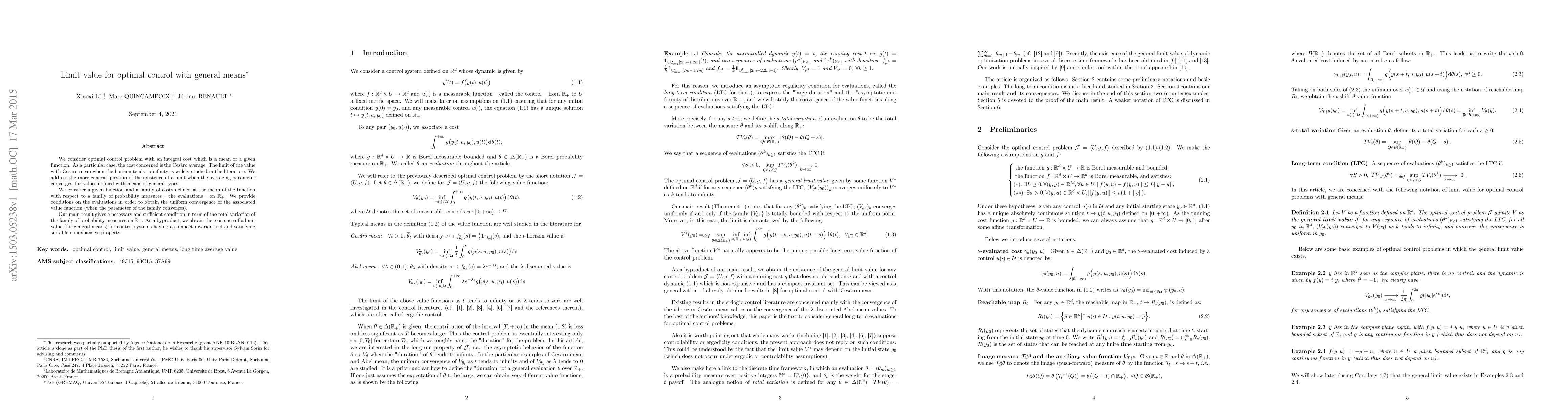 We consider optimal control problem with an integral cost which is a mean of a given function. As a particular case, the cost concerned is the Ces\`aro average. The limit of the value with Ces\`aro mean when the horizon tends to infinity is widely studied in the literature. We address the more general question of the existence of a limit when the averaging parameter converges, for values defined with means of general types. We consider a given function and a family of costs defined as the mean of the function with respect to a family of probability measures -- the evaluations -- on R_+. We provide conditions on the evaluations in order to obtain the uniform convergence of the associated value function (when the parameter of the family converges). Our main result gives a necessary and sufficient condition in term of the total variation of the family of probability measures on R_+. As a byproduct, we obtain the existence of a limit value (for general means) for control systems having a compact invariant set and satisfying suitable nonexpansive property.
