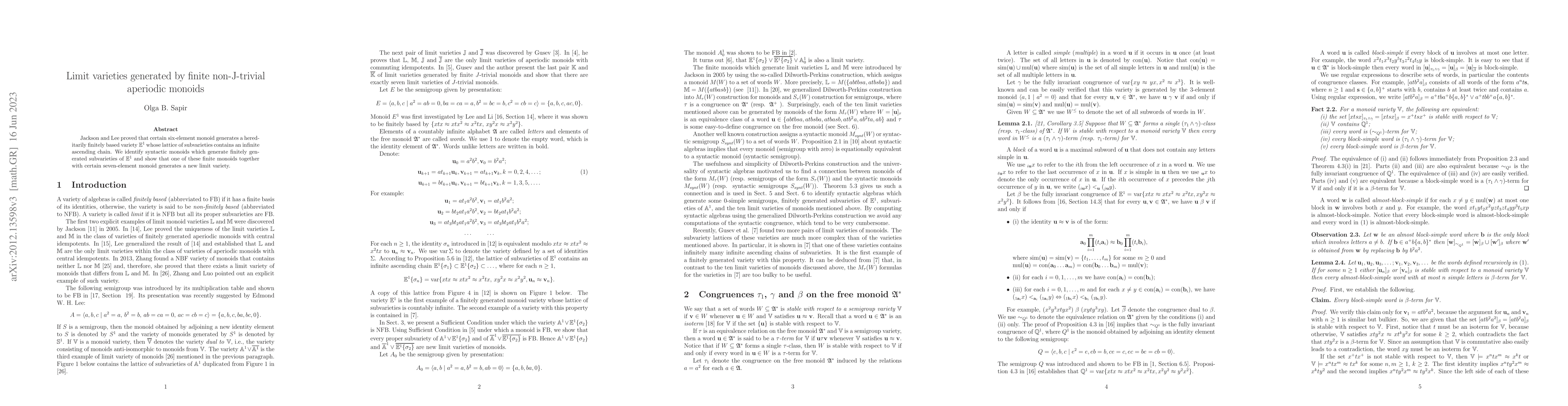 Jackson and Lee proved that certain six-element monoid generates a hereditarily finitely based variety $\mathbb E^1$ whose lattice of subvarieties contains an infinite ascending chain. We identify syntactic monoids which generate finitely generated subvarieties of $\mathbb E^1$ and show that one of these finite monoids together with certain seven-element monoid generates a new limit variety.