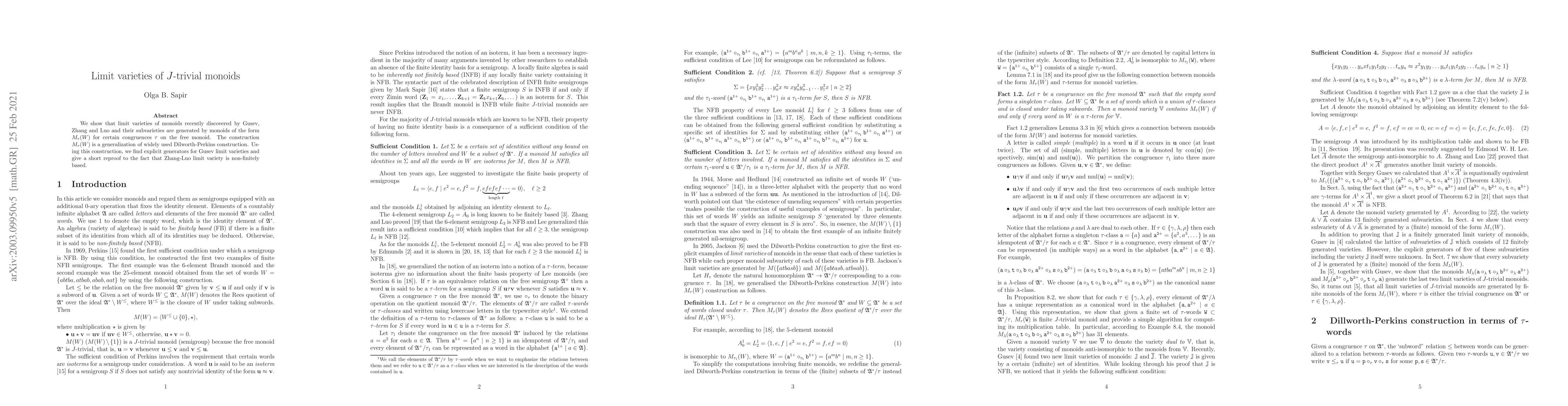 This paper demonstrates that limit varieties of $J$-trivial monoids, identified by Gusev, Zhang, and Luo, are generated by specific monoids $M_\tau(W)$ derived from certain congruences $\tau$ on the free monoid, generalizing the Dilworth-Perkins construction. It provides explicit generators for these varieties and reaffirms the non-finitely based nature of the Zhang-Luo limit variety.