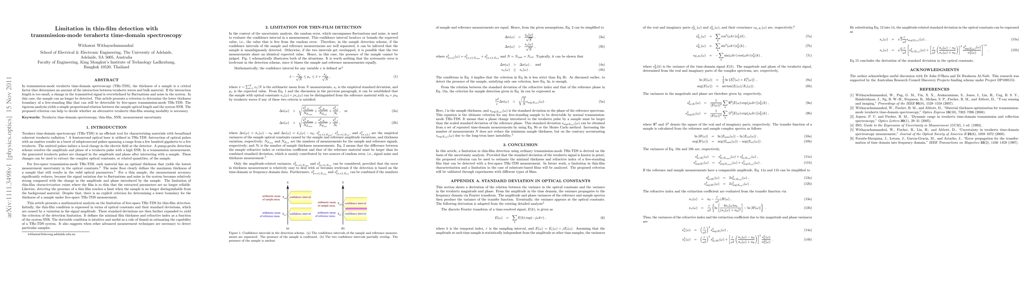 This paper discusses the limitations in detecting thin films using transmission-mode terahertz time-domain spectroscopy (THz-TDS). It proposes a criterion to determine the minimum detectable thickness of a free-standing film, based on a proportional relationship between the sample's optical length and the system's signal-to-noise ratio (SNR).