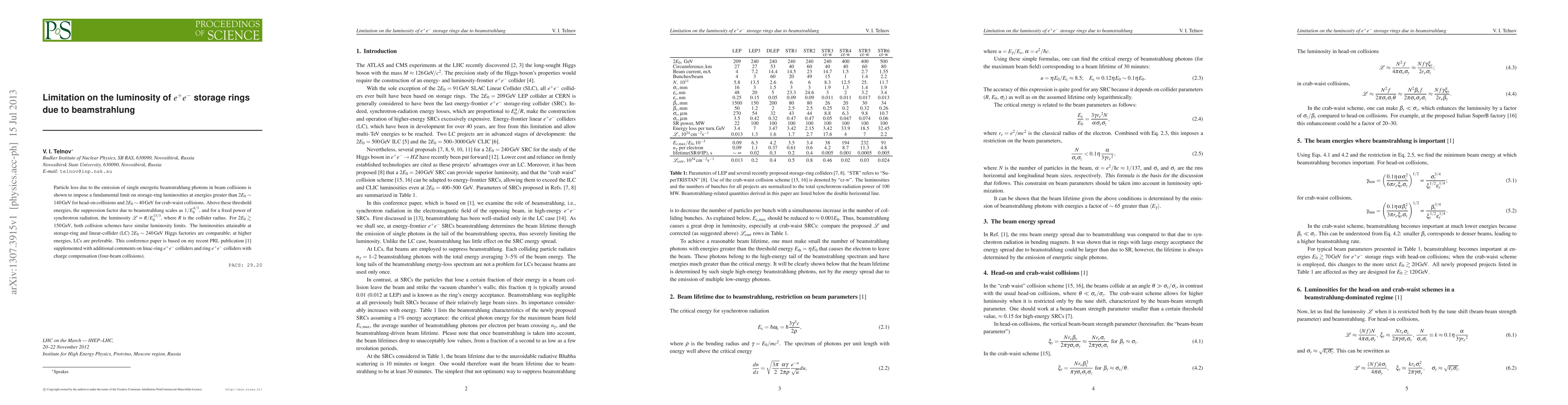 Particle loss due to the emission of single energetic beamstrahlung photons in beam collisions is shown to impose a fundamental limit on storage-ring luminosities at energies greater than 2E~140 GeV for head-on collisions and 2E~40 GeV for crab-waist collisions. Above these threshold energies, the suppression factor due to beamstrahlung scales as 1/E^{4/3}, and for a fixed power of synchrotron radiation, the luminosity L is proportional to R/E^{13/3}, where R is the collider radius. For 2E > 150 GeV, both collision schemes have similar luminosity limits. The luminosities attainable at storage-ring and linear-collider (LC) 2E=240 GeV Higgs factories are comparable; at higher energies, LCs are preferable. This conference paper is based on my recent PRL publication [1], supplemented with additional comments on linac-ring e+e- colliders and ring e+e- colliders with charge compensation (four-beam collisions).