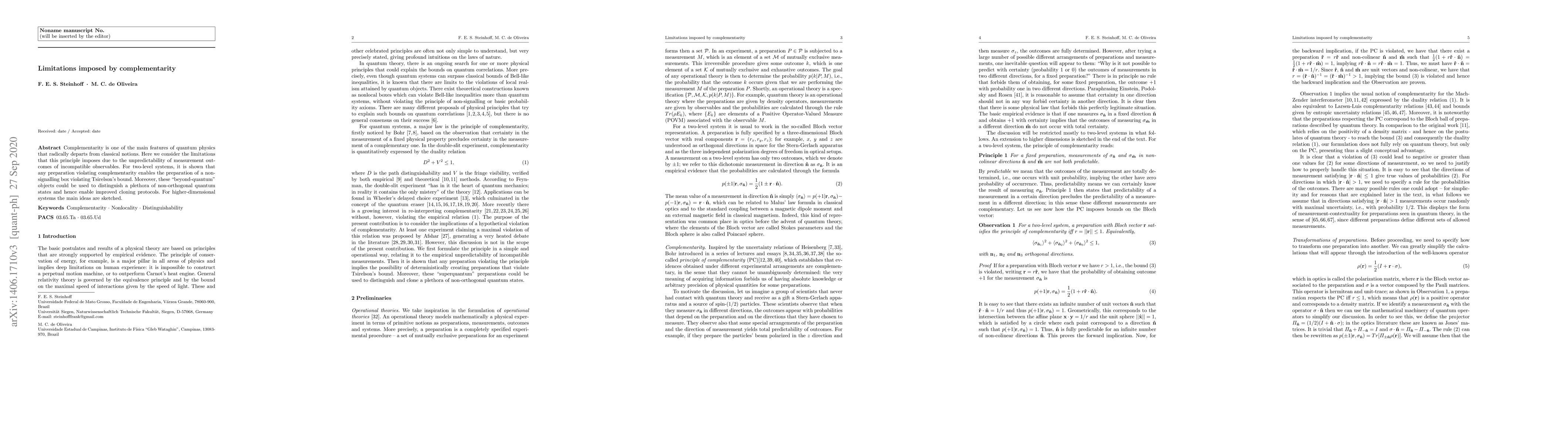 Complementarity is one of the main features of quantum physics that radically departs from classical notions. Here we consider the limitations that this principle imposes due to the unpredictability of measurement outcomes of incompatible observables. For two-level systems, it is shown that any preparation violating complementarity enables the preparation of a non-signalling box violating Tsirelson's bound. Moreover, these "beyond-quantum" objects could be used to distinguish a plethora of non-orthogonal quantum states and hence enable improved cloning protocols. For higher-dimensional systems the main ideas are sketched.