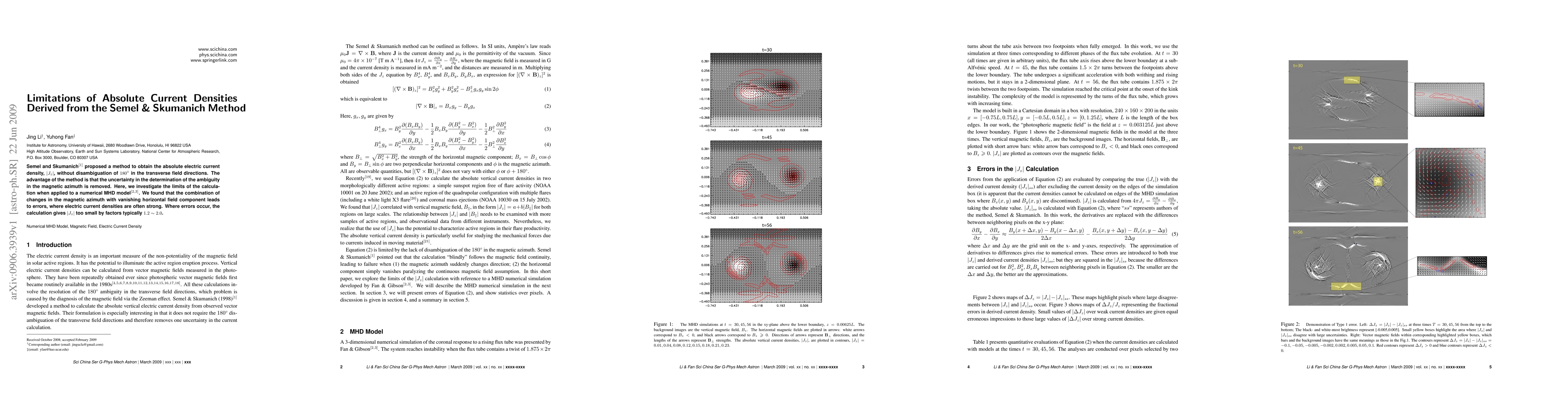 Semel and Skumanich proposed a method to obtain the absolute electric current density, |Jz|, without disambiguation of 180 degree in the transverse field directions. The advantage of the method is that the uncertainty in the determination of the ambiguity in the magnetic azimuth is removed. Here, we investigate the limits of the calculation when applied to a numerical MHD model. We found that the combination of changes in the magnetic azimuth with vanishing horizontal field component leads to errors, where electric current densities are often strong. Where errors occur, the calculation gives |Jz| too small by factors typically 1.2 ~ 2.0.