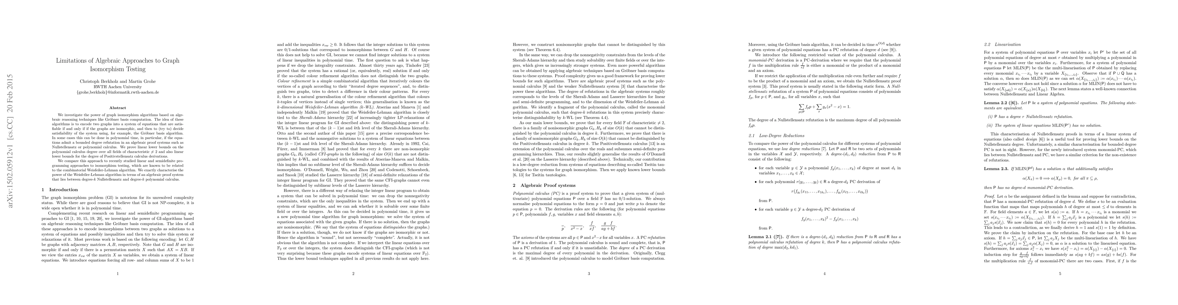 This paper examines algebraic graph isomorphism testing via Gröbner basis computation, proving linear lower bounds for polynomial calculus and Positivstellensatz calculus degrees. It compares these algebraic methods to linear and semidefinite programming approaches, characterizing the Weisfeiler-Lehman algorithm's power in an algebraic proof system.