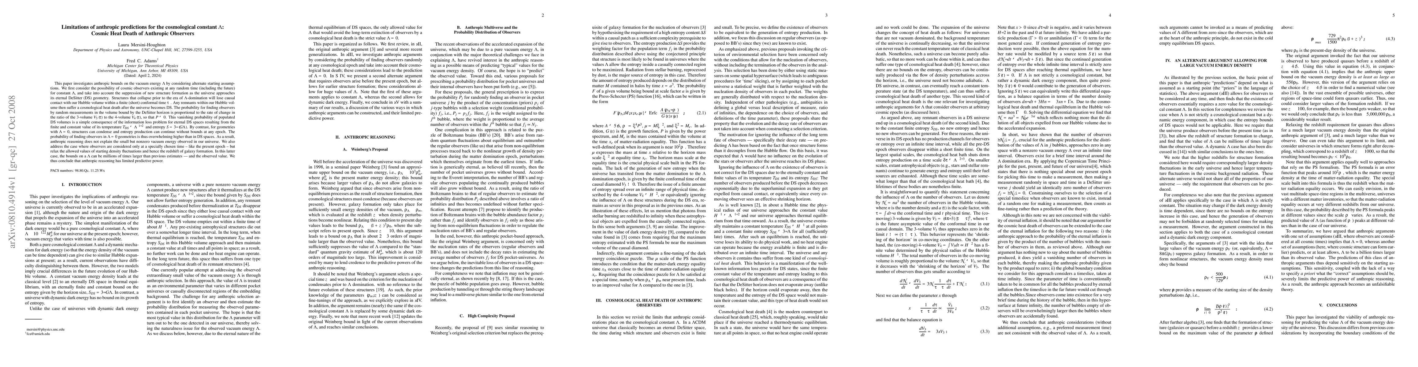 This paper investigates anthropic bounds on the vacuum energy $\Lambda$. We first consider the possibility of cosmic observers existing at any random time (including the future) for constant $\Lambda$, and take into account the suppression of new structure formation as the universe approaches its eternal DeSitter (DS) geometry. Structures that collapse prior to the era of $\Lambda$-domination will lose causal contact with our Hubble volume within a finite (short) conformal time $\tau_{\ast}$. Any remnants within our Hubble volume then suffer a cosmological heat death after the universe becomes DS. The probability for finding observers by random measurements in the volume bound by the DeSitter horizon is $P \simeq 0$, and it is a simple consequence of the information loss problem for eternal DS spaces resulting from the finite and constant value of its temperature $T_{DS} \simeq \Lambda^{-1/2}$ and entropy $S = 3/(G\Lambda)$. By contrast, for geometries with $\Lambda = 0$, structures can condense and entropy production can continue without bounds at any epoch. The probability of finding observers in $\Lambda = 0$ geometries is thus overwhelming higher than in DS spaces. As a result, anthropic reasoning does not explain the small but nonzero vacuum energy observed in our universe. We also address the case where observers are considered only at a specially chosen time -- like the present epoch -- but relax the allowed values of starting density fluctuations and hence the redshift of galaxy formation. In this latter case, the bounds on a $\Lambda$ can be millions of times larger than previous estimates -- and the observed value. We thus conclude that anthropic reasoning has limited predictive power.