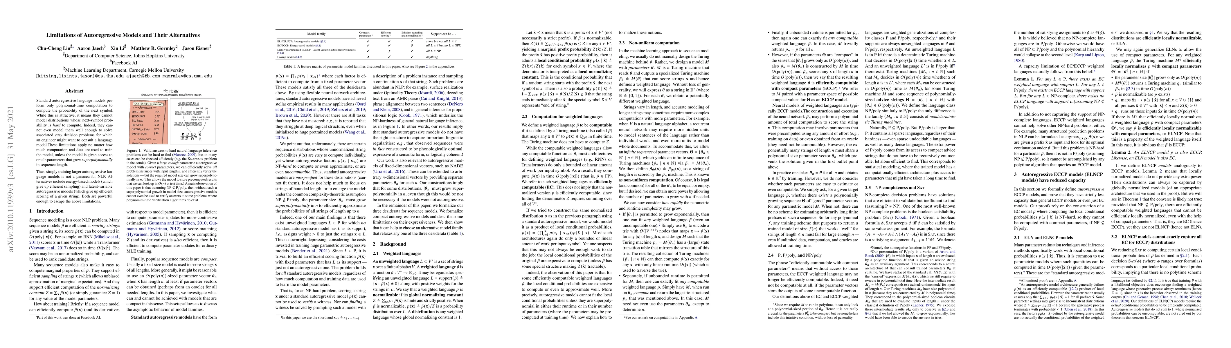 Standard autoregressive language models perform only polynomial-time computation to compute the probability of the next symbol. While this is attractive, it means they cannot model distributions whose next-symbol probability is hard to compute. Indeed, they cannot even model them well enough to solve associated easy decision problems for which an engineer might want to consult a language model. These limitations apply no matter how much computation and data are used to train the model, unless the model is given access to oracle parameters that grow superpolynomially in sequence length. Thus, simply training larger autoregressive language models is not a panacea for NLP. Alternatives include energy-based models (which give up efficient sampling) and latent-variable autoregressive models (which give up efficient scoring of a given string). Both are powerful enough to escape the above limitations.