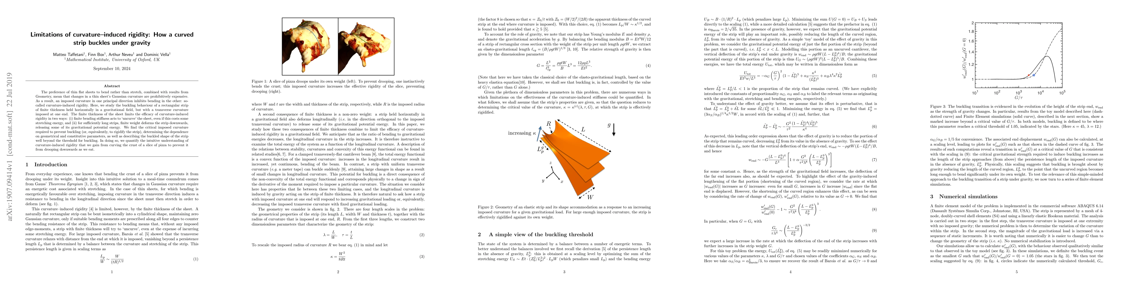 A study investigates how a curved strip of finite thickness resists buckling under gravity when its end is given a transverse curvature, revealing the critical imposed curvature required to prevent buckling.