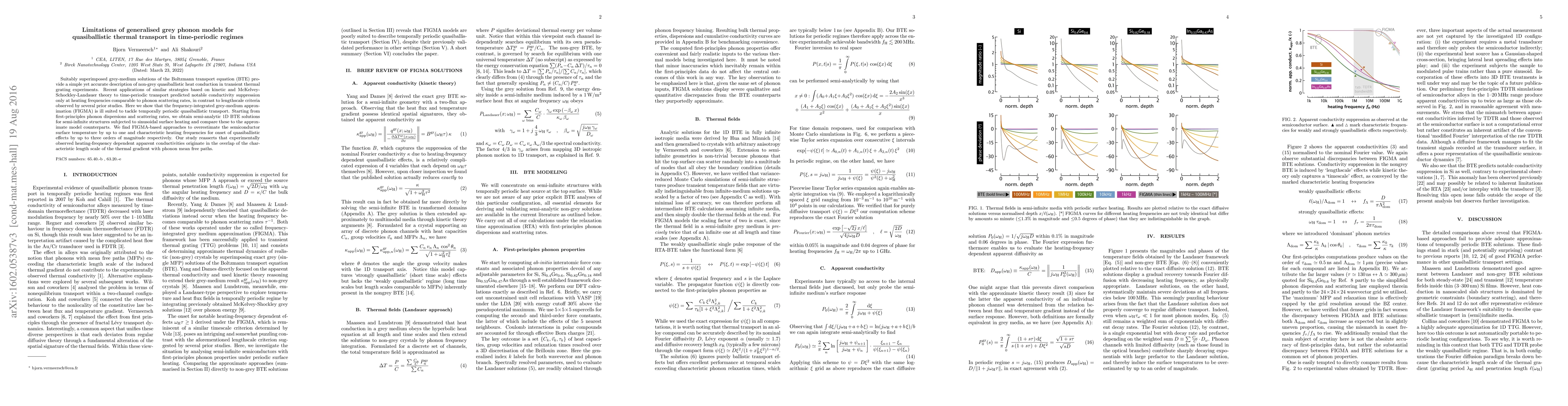 Suitably superimposed grey-medium solutions of the Boltzmann transport equation (BTE) provide a simple yet accurate description of non-grey quasiballistic heat conduction in transient thermal grating experiments. Recent applications of similar strategies based on kinetic and McKelvey-Schockley-Landauer theory to time-periodic transport predicted notable conductivity suppression only at heating frequencies comparable to phonon scattering rates, in contrast to lengthscale criteria observed by several prior studies. Here we show that the frequency-integrated grey-medium approximation (FIGMA) is ill suited to tackle temporally periodic quasiballistic transport. Starting from first-principles phonon dispersions and scattering rates, we obtain semi-analytic 1D BTE solutions for semi-infinite structures subjected to sinusoidal surface heating and compare these to the approximate model counterparts. We find FIGMA-based approaches to overestimate the semiconductor surface temperature by up to one and characteristic heating frequencies for onset of quasiballistic effects by up to three orders of magnitude respectively. Our study reasserts that experimentally observed heating-frequency dependent apparent conductivities originate in the overlap of the characteristic length scale of the thermal gradient with phonon mean free paths.