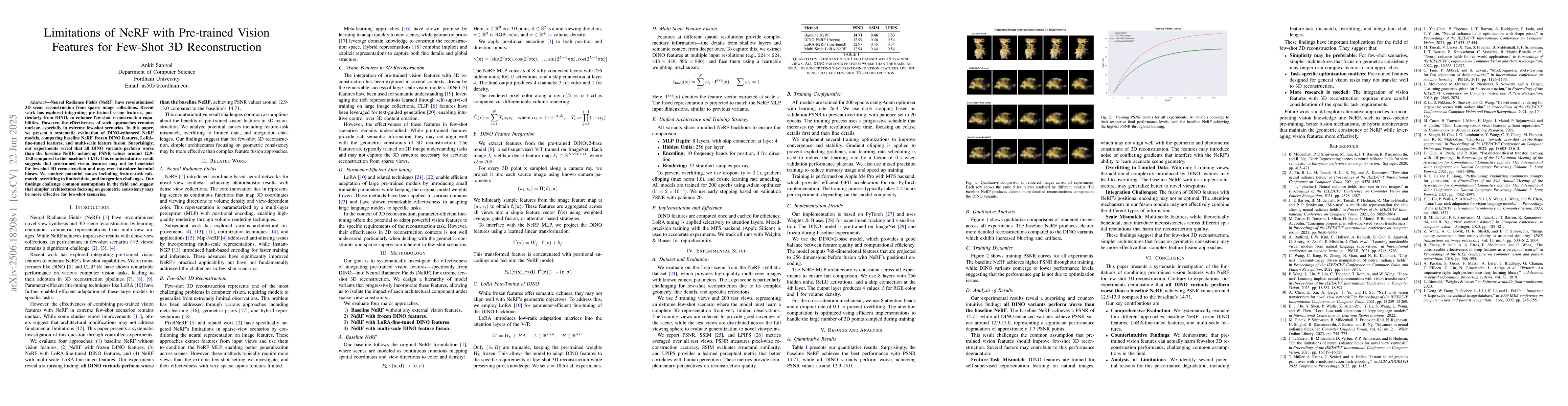 Neural Radiance Fields (NeRF) have revolutionized 3D scene reconstruction from sparse image collections. Recent work has explored integrating pre-trained vision features, particularly from DINO, to enhance few-shot reconstruction capabilities. However, the effectiveness of such approaches remains unclear, especially in extreme few-shot scenarios. In this paper, we present a systematic evaluation of DINO-enhanced NeRF models, comparing baseline NeRF, frozen DINO features, LoRA fine-tuned features, and multi-scale feature fusion. Surprisingly, our experiments reveal that all DINO variants perform worse than the baseline NeRF, achieving PSNR values around 12.9 to 13.0 compared to the baseline's 14.71. This counterintuitive result suggests that pre-trained vision features may not be beneficial for few-shot 3D reconstruction and may even introduce harmful biases. We analyze potential causes including feature-task mismatch, overfitting to limited data, and integration challenges. Our findings challenge common assumptions in the field and suggest that simpler architectures focusing on geometric consistency may be more effective for few-shot scenarios.
